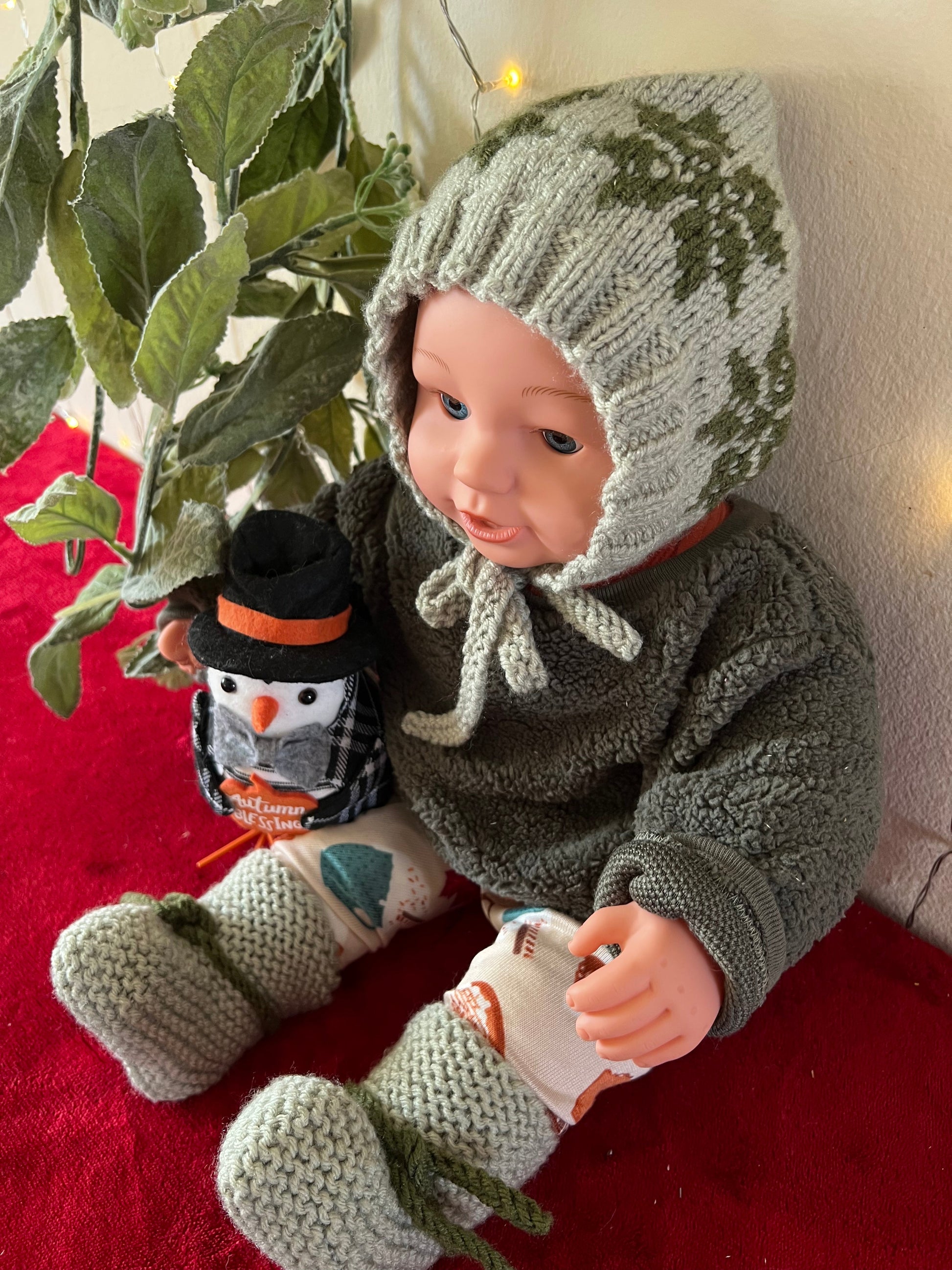 Baby Bonnet Green Snowflake Design Hand Knit Soft Baby Yarn (12+ Months)