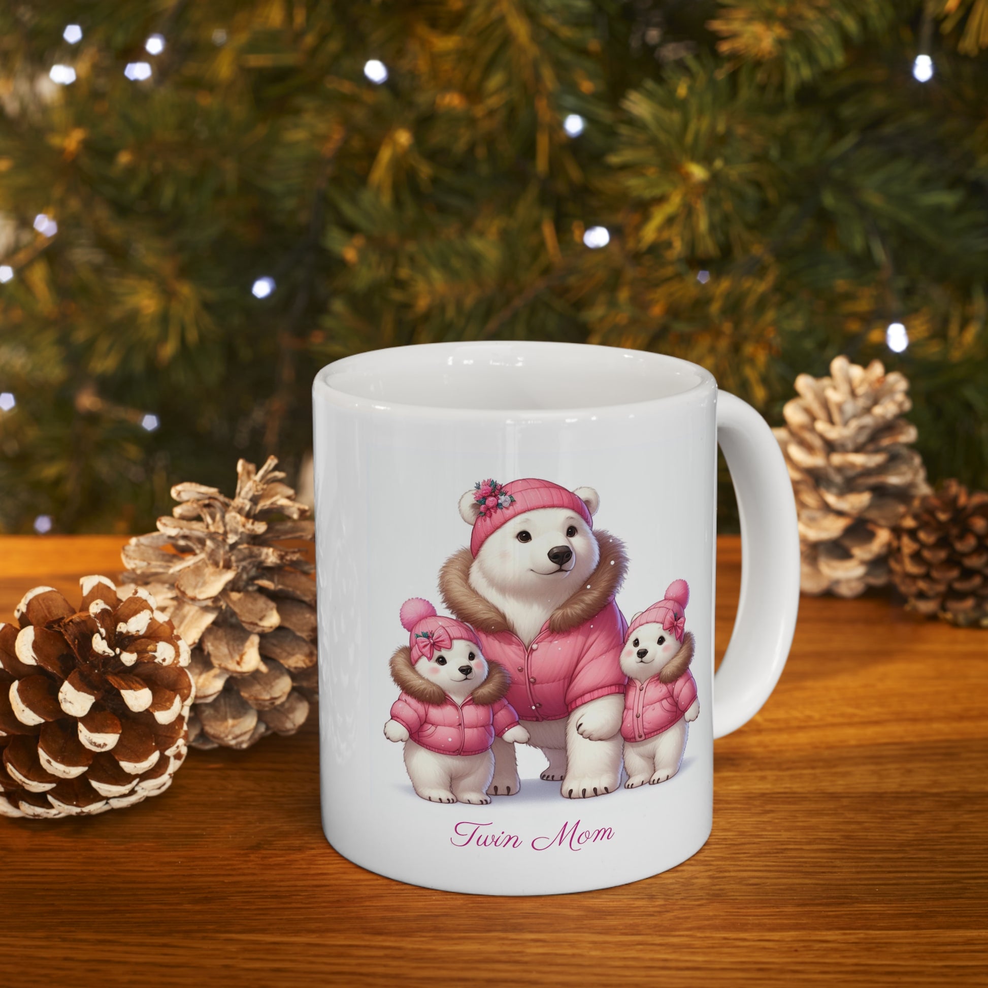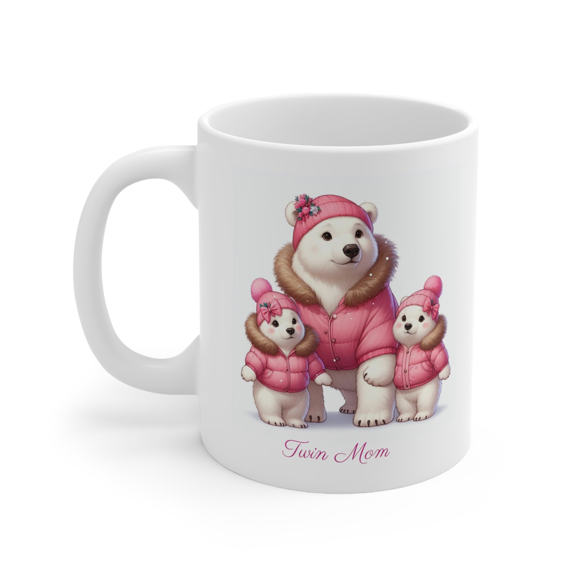 Crafted with love and attention to detail, the mug features a charming illustration of a nurturing mama polar bear cuddling her twin cubs. The sweet and endearing design encapsulates the warmth and joy that defines the special journey of being a twin mom.